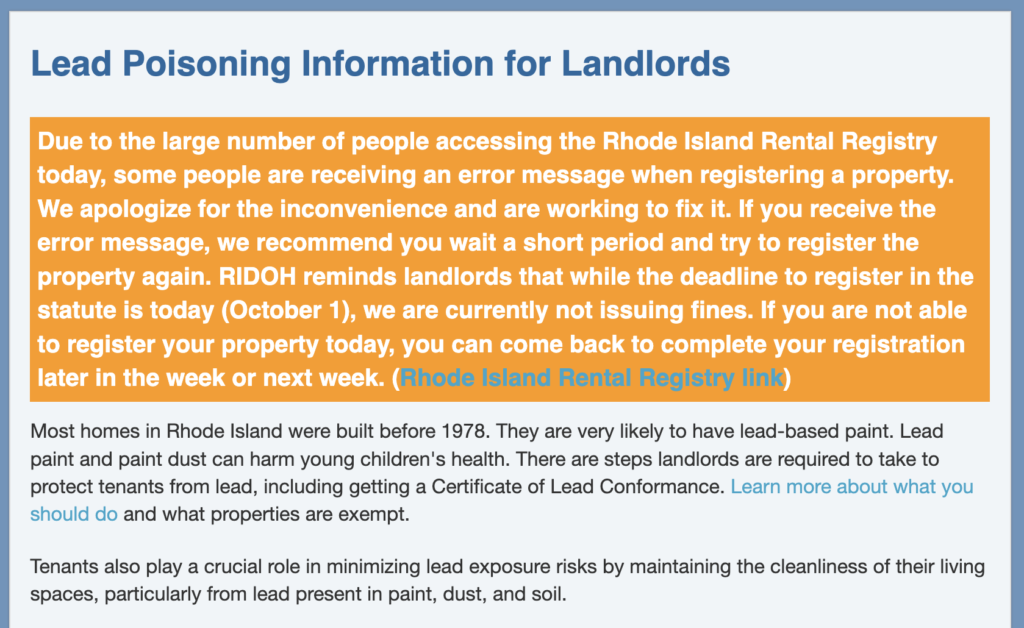 Rhode Island Department of Health on Tuesday, the deadline for all landlords to register rental properties and provide evidence of lead-based paint removal work done to remove lead-based paint on older properties. ‘s new website pages were plagued with delays and errors.
